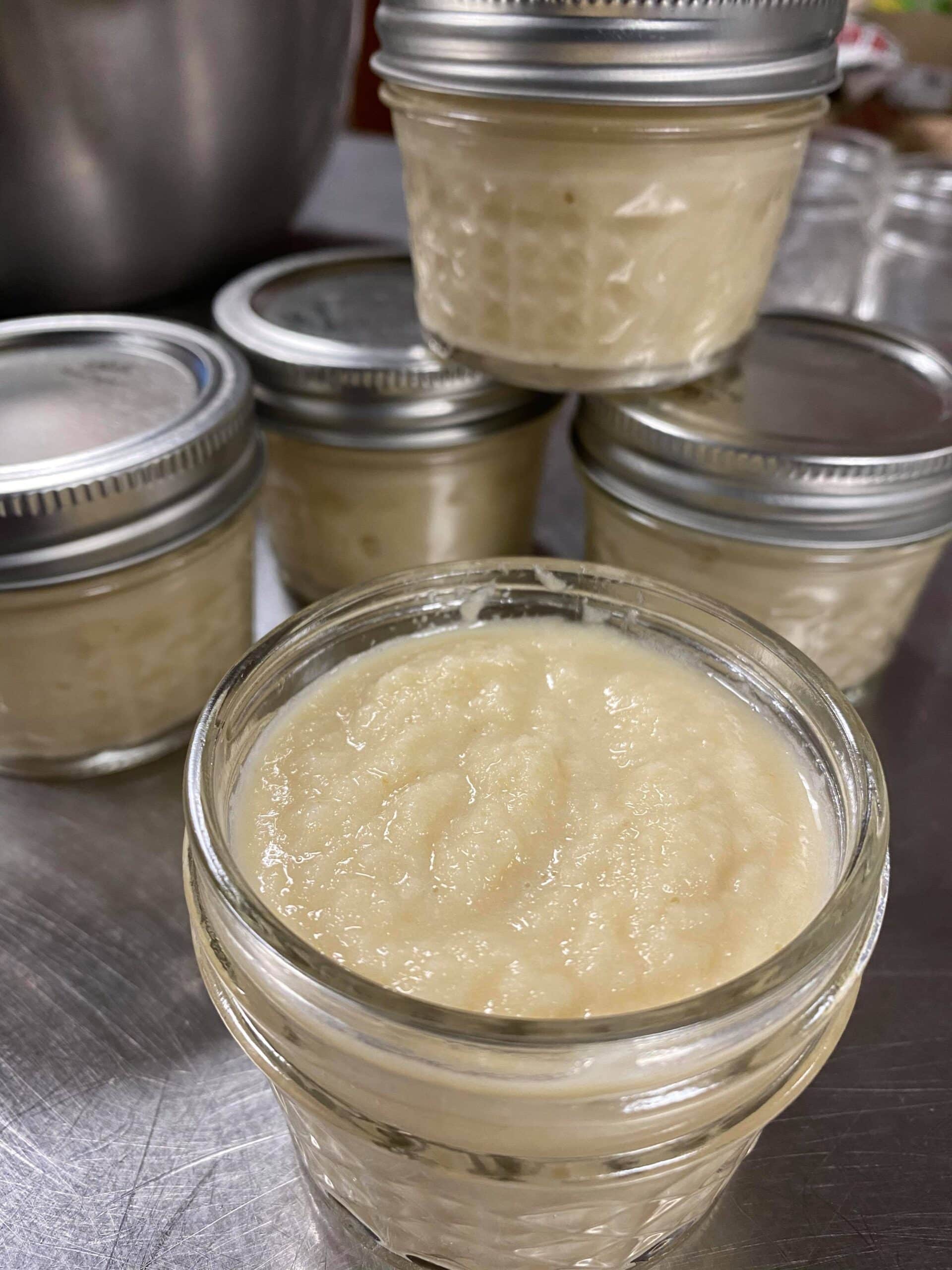 Horseradish from our garden, finely grated and prepared with white vinegar and salt. Use for beet salad, cocktail sauce, etc