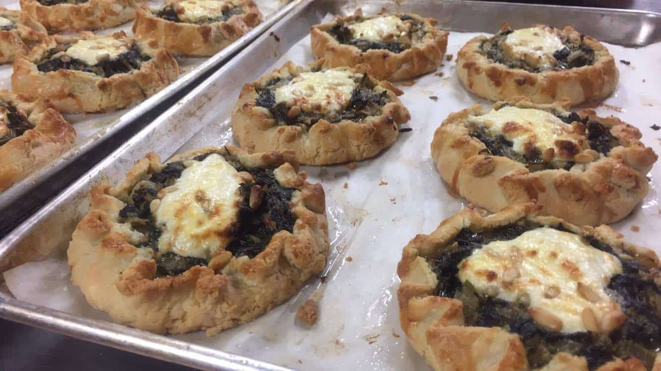 Flaky handmade pastry filled with braised Swiss chard, caramelized onions, aged cheddar and herbs, topped with ricotta, pine nuts.